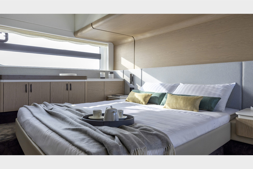 Below decks the 'spacious' persona carries on with a VIP guest stateroom, a second guest stateroom with twin beds, and a full beam master suite at midships. The master suite is nothing short of impressive and is aided significantly by the boat's ample beam of 4.95 m (16'3"). The guest stateroom, for its part, has space for a washer/dryer, and the master suite boasts a walk-in closet with multiple storage cabinets. Each stateroom also carries its own head, and an additional rear captain's cabin provides quarters for crew or guests.