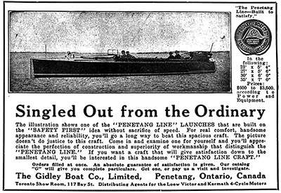 In the early 1900’s he shared waterfront accommodations in Penetanguishene with the Adams Launch and Engine Company which supplied engines for some of Gidley’s boats. Before the end of 1910, Gidley Boats claimed to be the largest builder of pleasure boats in Canada by utilizing assembly line production techniques.