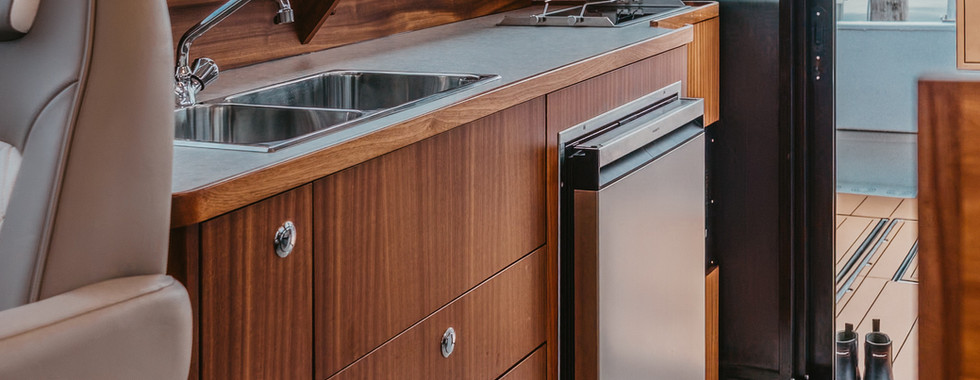 Other perks include a wireless phone charger mounted at the main helm, dual USB A and C outlets throughout the cabin and sleeping areas, Interior LED cabin lighting, and a 3kW inverter/charger.