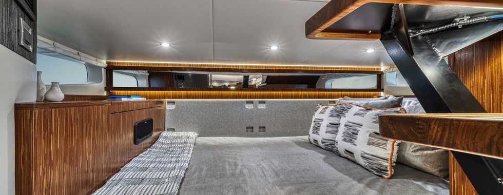 In terms of tech at the helm, owners will appreciate Active Trim control & monitoring and optional Dynamic Running Surface™. The helm is also equipped with Digital Dash™ that includes dual 16″ Simrad® NSO evo3 touchscreen displays. Other highlights include Mercury VesselView® Mobile that you can link to your smartphone, CZone® digital switching and a Fusion® audio system with an Apollo RA770 touchscreen display. The boat can also be upgraded with Simrad HALO24 radar, Seakeeper® 3 gyroscope stabilizer, 1st Mate™ Marine Safety & Security System, and an LED RGB-W color-changing lighting package.