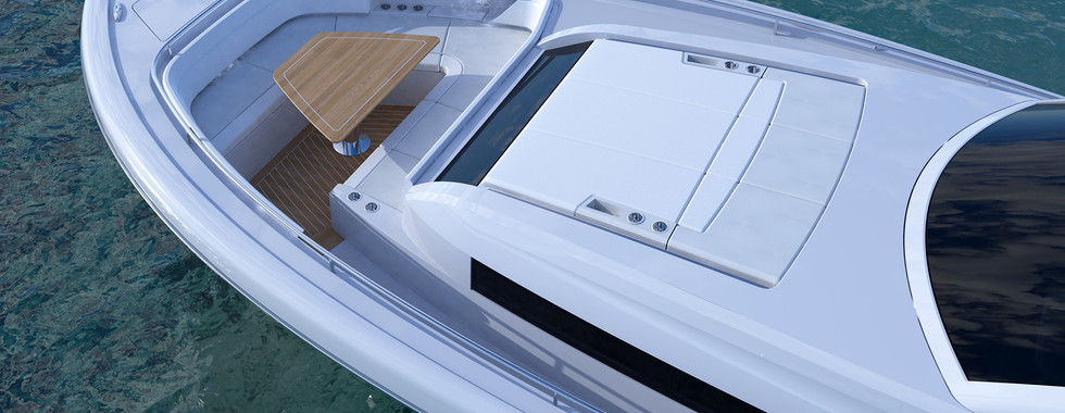 Accessed through a port-side bulkhead door, the command deck is designed to bring the outdoors inside with its powered aft bulkhead window and sunroof. There are also port and starboard powered doors that slide aft. They provide full-beam access from the three-person forward control station while also ushering in refreshing breezes for those relaxing in the aft seating area.